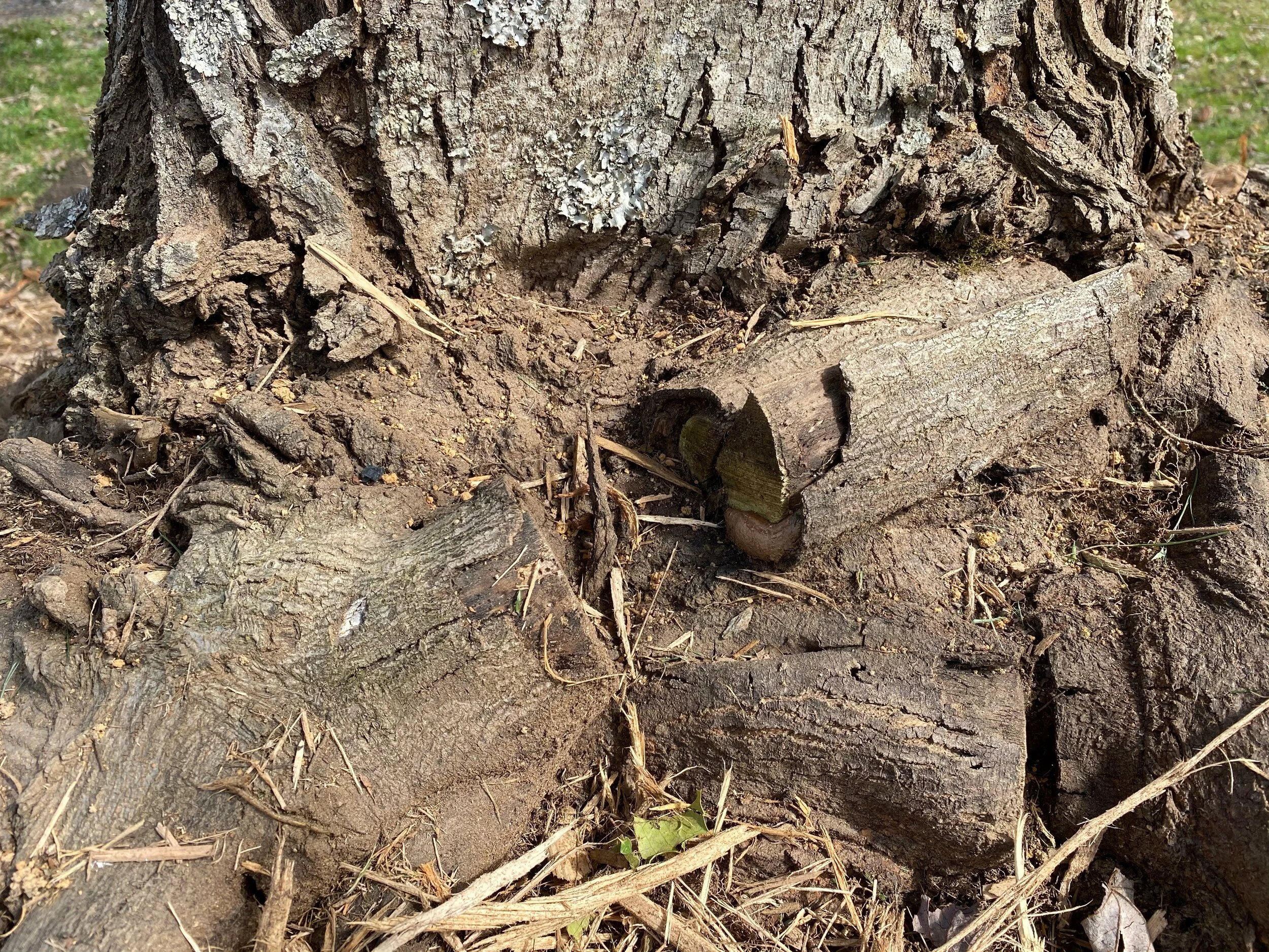 We’ll have to do this tree surgery at least another two times to keep the trees healthy and remove all the upward root growth, encouraging strong growth in the soil. We’re vertical mulching to increase the microbiome’s activity, which will provide more resources for the trees. The trees were planted in field that used to be cow pasture and then piled with fill from the dirt from the building of the nearby road, making the soil rejuvenation work absolutely necessary. And by cutting and rejuvenating the soil, over time, with care, the girdling mass that was strangling these red maples is something we are able to pull away: